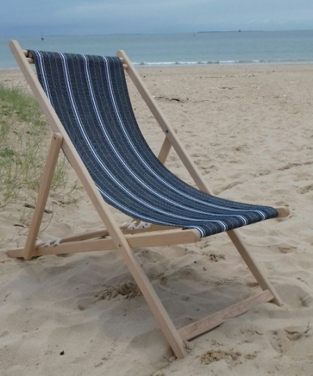 Transat chilienne simple en hêtre et tissu en coton noir et blanc rayé bleu et blanc (sans bras – sans allonge)