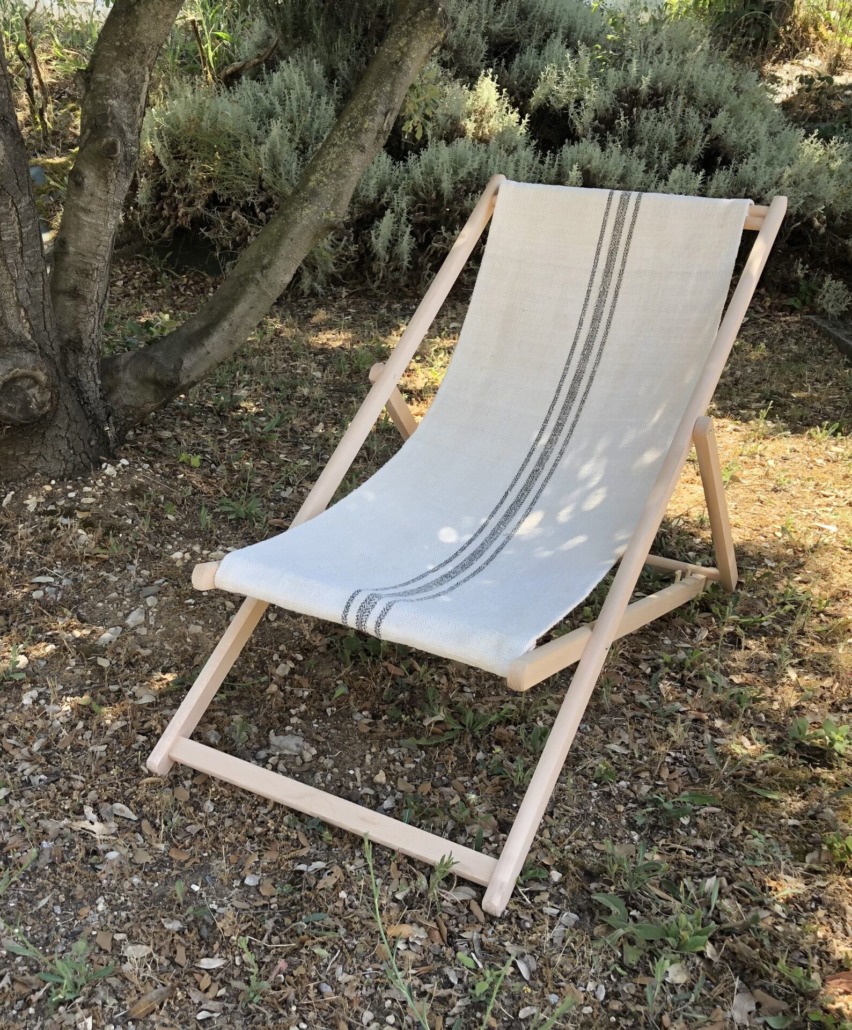 Transat chilienne simple en hêtre et tissu en ancien sac de farine en chanvre rayé noir (sans bras – sans allonge).