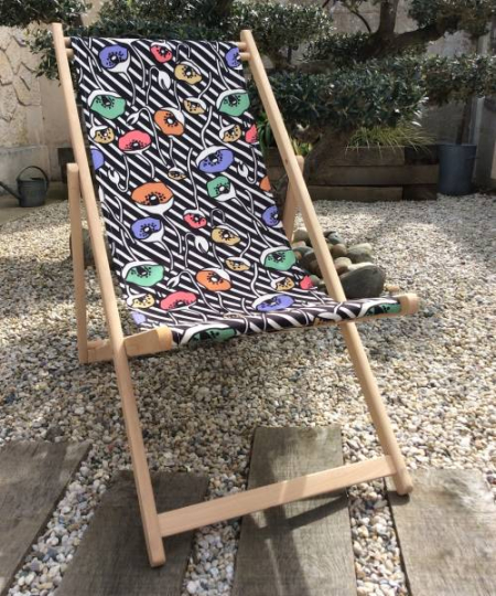 Transat chilienne simple en hêtre et tissu en polyester rayé noir et blanc avec des fleurs de pavots colorées (sans bras – sans allonge).