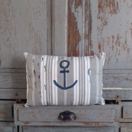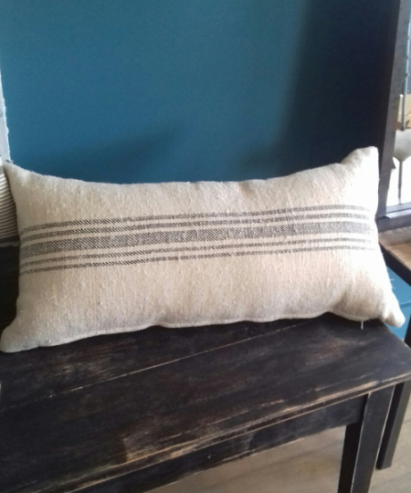 Coussin en chanvre rayé noir, entièrement déhoussable réalisé dans un ancien sac à grains, fermé par glissière.