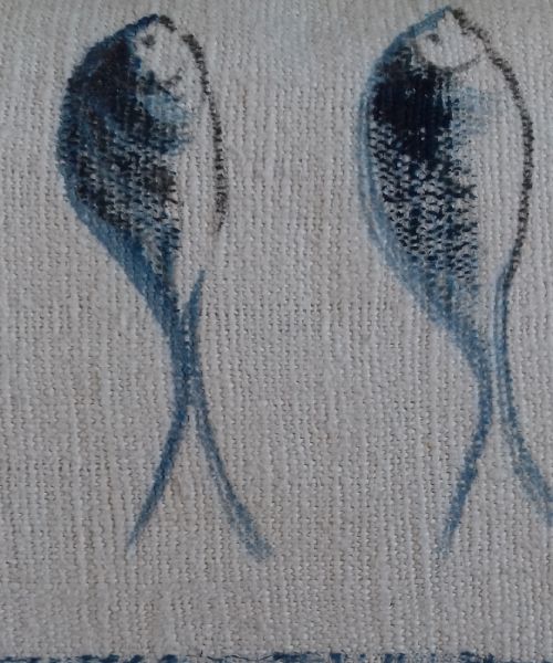 Ce coussin a été peint et cousu entièrement à la main par une artiste locale, garantissant ainsi son unicité et son authenticité.