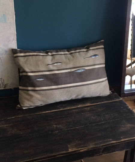 Le Coussin sardine est réalisé à partir d’une ancienne toile à matelas, ce qui lui confère une authenticité et un style unique.
