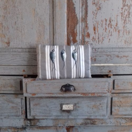 Coussin sardine peint et cousu entièrement à la main, réalisé dans une ancienne toile à matelas.