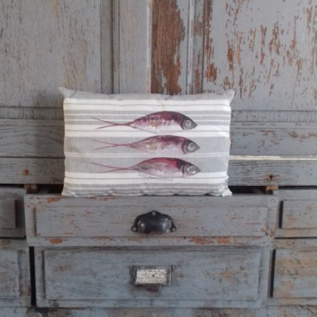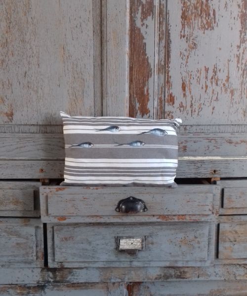 Avec ses motifs de sardines bleues, ce coussin apporte une touche de fraîcheur et une ambiance bord de mer, s’accordant parfaitement à différents styles de décoration.
