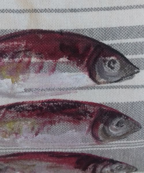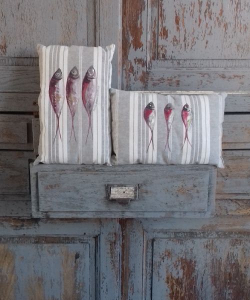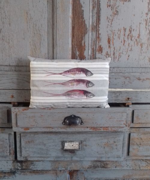 Ce coussin est une pièce unique réalisée à la main par une artiste locale. Il insufflera une ambiance bord de mer dans votre intérieur grâce à son motif original de sardines. Son design artisanal et ses couleurs élégantes ajoutent une touche d’authenticité et de chaleur à n’importe quel espace.