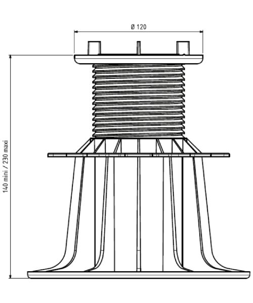 Le plot de terrasse est réglable en hauteur de 140 mm à 230 mm, offrant ainsi une flexibilité qui s’adapte à divers besoins d’installation.