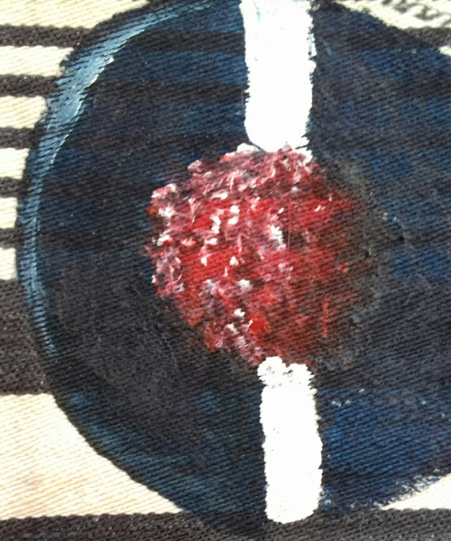 Réalisée et peinte entièrement à la main par une artiste locale, dans un tissu ancien (toile à matelas) doublée tissu bleu, fermeture éclair bordeaux.